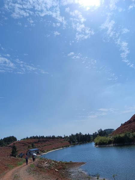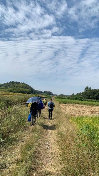 天空云彩是大片,江背人民热情,第一个补给点,大叔家凉开水桌上两大壶,夸赞水很好,炒米两种口味敞开试,猫咪一大一小,一黄一狸,狗狗一大一小同色。我们坐在桂花树下休息片刻,看猫玩耍,赏花听风,主打休闲不赶路。中饭太早,不得不继续前行,穿过大马路,一片侧柏叶墨绿中穿梭,沟堤两边黄豆夹多而密,水沟阴凉处鱼儿游来游去。翻过坡垭,稻田香,鸭儿游,黑猪一群群山中树下圈养,板栗路边随你打。半小时功夫,有人午餐,有人睡觉,有人一边打板栗一边午餐,然后提着刺果来到第二个补给点,大姐热情一人一杯茶,花生饼干随你拿,她客气,我们也客气,借地撵板栗,头上飘桂花,谈笑风生乐开怀。