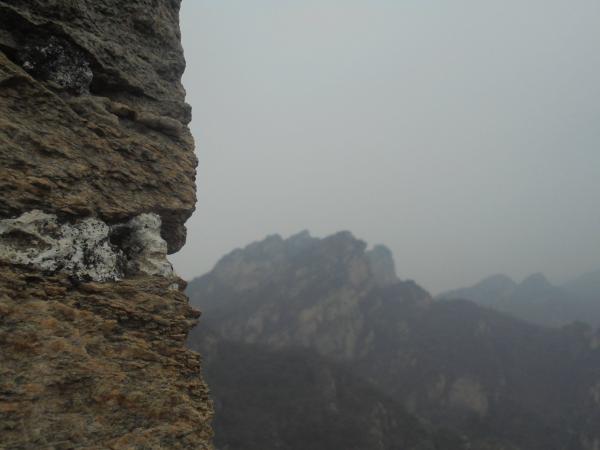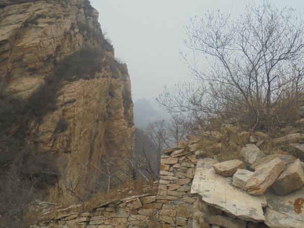 5.自墙体6西端循石缝上行,继续向高尖楼、大良山行进,接下来一段山脊相对不连续,多孤峰、巉岩,小路多借助岩石间稍平缓的缝隙,在山脊两侧穿插行进,途中一处险境,小路自石岩西侧摩崖而上,巉岩外展形成石塘,有走友依其象形称为“老虎嘴”。老虎嘴上方,山势略显平缓,古人旋即见缝插针修建墙体7,使天人合力之防线完全不留死角。