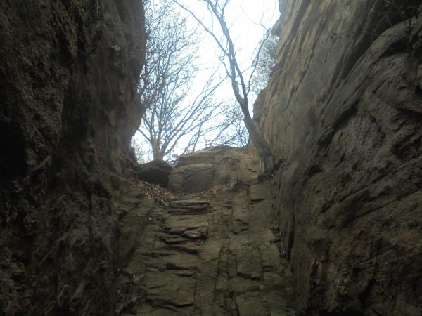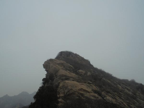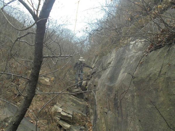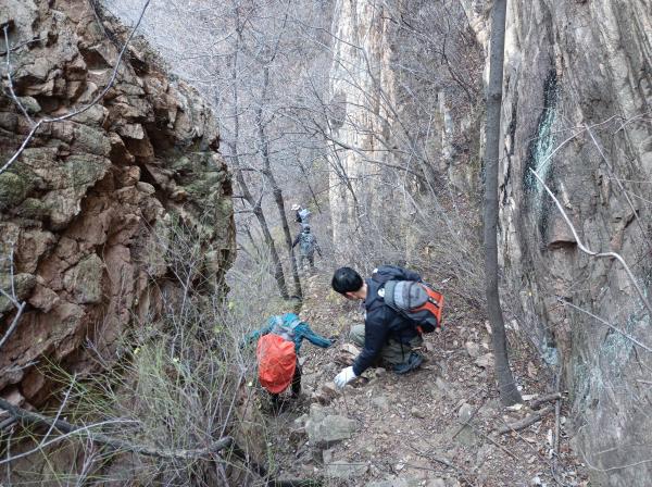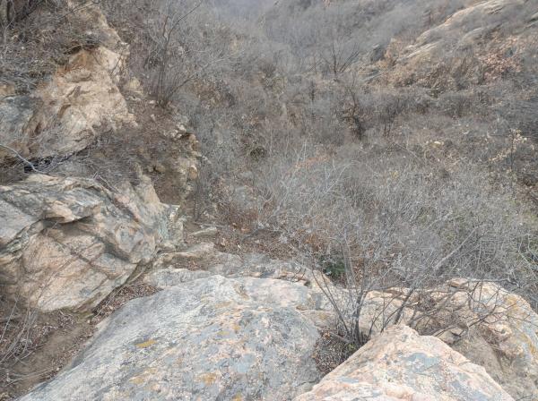 6.墙体7以西至775高地,山脊进入白道峪与牛盆峪之间最为险峻一段,流云淤滞,无存逾越之通廊,鹰隼旋落,难有筑巢之罅穴,走友需寻觅节理裂隙方可从重重迷障中侥幸突破。自墙体7西端循小径陡升,不远困入一裂隙,上仅以一小断崖同天穹连通,此即为本路线最大的难点所在,小断崖高度不高,岩壁也并非垂直,走友从左侧借助岩点可攀爬而上,但这里的岩壁较为光滑,且岩点很小、不容易发现,攀爬难度较大,攀爬经验一般或雨雪季节,走友需借助绳索方可安全通过。