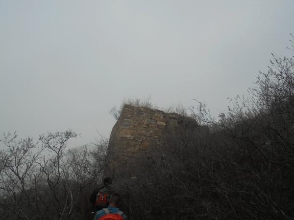 14.墙体10南侧的岩石山脊上,坐落有密云592号敌台,为山石干砌实心敌台,工艺粗糙,无三合土勾缝,保存现状一般。自此下山至墙体11一段路,小路痕迹总体清晰,但灌木荆棘相对茂密,部分路段密灌几已长严,有大量酸枣、麻梨疙瘩生长,走友钻行而过,皮肉之苦定是难以避免。钻行一段距离后,自右侧攀下一小断崖,即可来到牛盆峪水关东侧缓坡的墙体11之上,该墙体为毛石垒砌、三合土勾缝的狭窄石墙,半幅为雉堞,半幅为人行道,今鬼针草生长较多,走友未及享受那行将返回文明世界的美好,即又是发觉已有满身针刺附着。