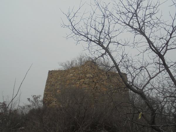 10.自高尖楼南行约700米后,一断崖将山脊隔断,这里走友需右转向西经一小段挂壁小道后,再回折向东陡升至坡顶。坡顶高地即为大良山所在,海拔716米,又称“大狼山”,或因古时常有狼群活动而得名,大良山山顶坐落有密云588号敌台,为毛石干砌实心敌台,无三合土勾缝,保存现状一般,西南侧半幅已经坍塌。值得一提的是,大良山与今推测的大良峪寨(即黑山寺城堡)距离较远,推测可能是“大良山”地名在古代只是泛泛之指、“大良峪寨”的位置自明代早期以来因改重建而出现变化、或从古至今相关地名的讹变所致。