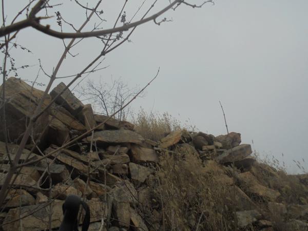 9.在高尖楼二层稍作赏景、休息、拍照、嘚瑟后,走友转而沿其南侧山脊行进去往大良山、牛盆峪方向。因云蒙山岩基边缘特有的花岗岩单斜地貌,高尖楼南侧山脊较其东侧山脊明显更为平缓,先前随处可见的断崖、巉岩,已是逐渐销声匿迹,仅在山野中零星分布,而少了各种攀爬路段与复杂路况的阻碍,走友行走的舒适程度亦较先前有明显提升。高尖楼南侧不远,有小段墙体9高仅数十厘米,无法拦人拦马,不知出现在这里用意如何。