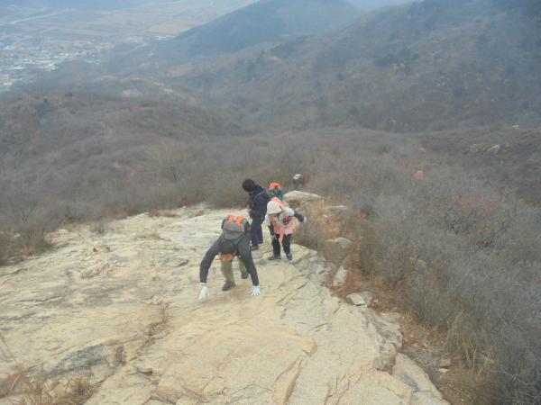 1.自581号敌台向西北沿山脊爬升,坡度基本在30°左右,其间间或有三两小光坡需攀爬而上,难度不大。爬升约220米后抵达坡顶,大慢坡突然中断,有小断崖1需走友攀爬而下,难度一般,有攀爬经验者可轻松通过。