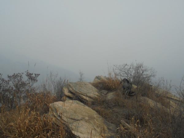 7.几经试探,艰难攀越小断崖,此后再经过一处较为简单的石板小断崖,即可来到775高地之上。775高地山顶没有任何标记,为此行路线的最高点所在,也有走友把这里称为大良山,但考虑到电子地图多将“大良山”标注于密云588号敌台处,走友此行还是认定后者为大良山之所在。775高地植被稀疏,视野开阔,北、东两面临崖,上可望云蒙群峰之神域、黄花绝顶之翠微,下可瞰白道幽谷之森森、密云水库之粼粼。