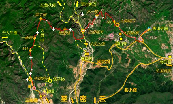 至白道峪水关,除大绝壁顶的未编号烽火台外,黑山寺西段-白道峪东段长城诸墙体、敌台已打卡完毕,午餐过后,时间刚到正午,所剩尚为充裕,走友遂继续准备前往绝壁楼、高尖楼、大良山等地。若走友时间不足或体力一般,也可从白道峪直接坐密9路支线(下午13:20、16:00有车)或步行至黑山寺站返程。另外,这里走友若是向南进村再右转上墙,亦可寻访小关山堡(密云56号城堡)、白道峪村内城堡(密云57号城堡)、白道峪关以西第1段墙体,但为避免在村中遭遇人为不确定因素,在此走友未至村落及提前右转走上山,将上述堡、墙切过。此后循白道峪西段、牛盆峪北段长城行进,全程皆可见较明显小路痕迹,且布条路标较为密集,难度总体略低于刚刚走过的黑山寺西段-白道峪东段长城,但因爬升较大、路程较长,且山势依旧相对险峻,间或有断崖、光坡等攀爬段落,仍对走友的体能、路感、攀爬能力与时间控制能力有一定要求,新、弱勿走,雨雪天气勿走。此后直至牛盆峪水关一段路,具体详述如下: