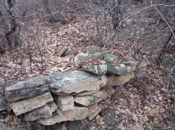 15.沿石墙下行约至一半,有密云593号敌台,该敌台为牛盆峪水关东侧守口墩,下部条石、毛石混合浆砌,上部毛石浆砌,为一所用建材相对复杂的实心敌台,今其四周有大量三合土散落,由此表明此敌台曾经或兼有城砖垒砌。临近水关处,另标注有密云594号敌台,此行走友仔细观察,并未在此发现有敌台遗存,查看中国长城遗产网,发现所用594号敌台图片实际拍摄的是水关西侧一未编号敌台,推测网站位置标注错误,水关西侧的未编号敌台实际应为真正的594号敌台所在,而图标的594号敌台处实际并无敌台设置。