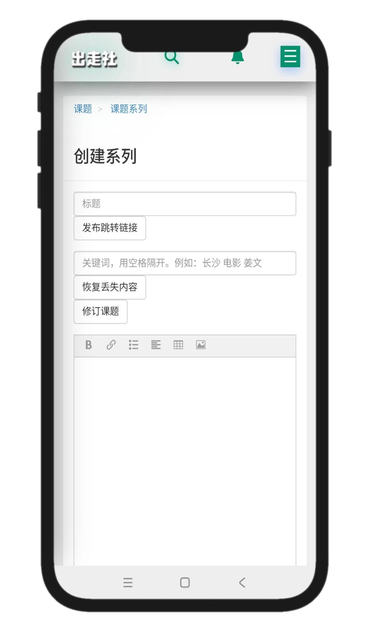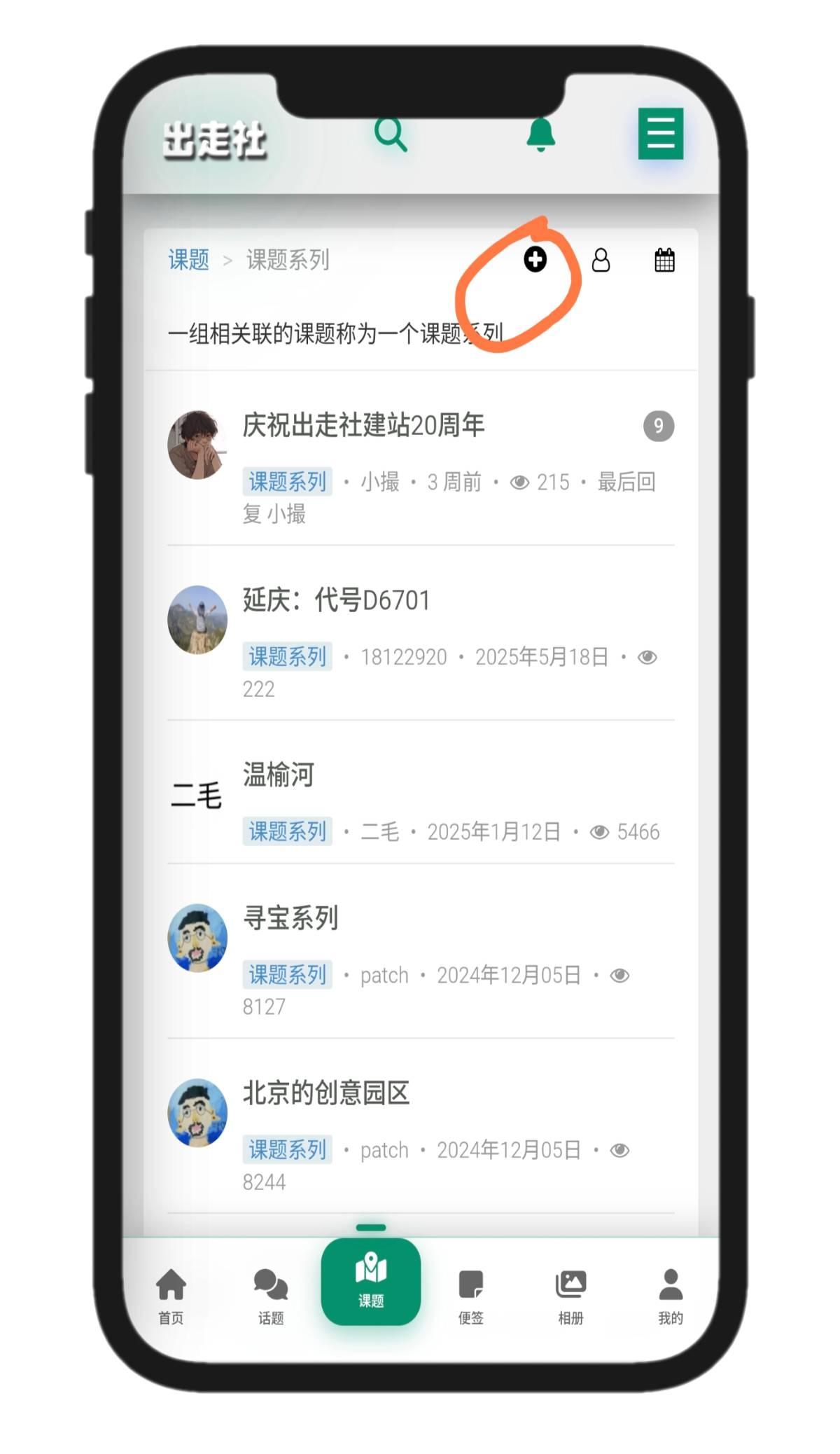 打开一个系列,在标题下方点击加号,跳转到选择课题类别的页面,选择课题类别,进入发布课题页面。