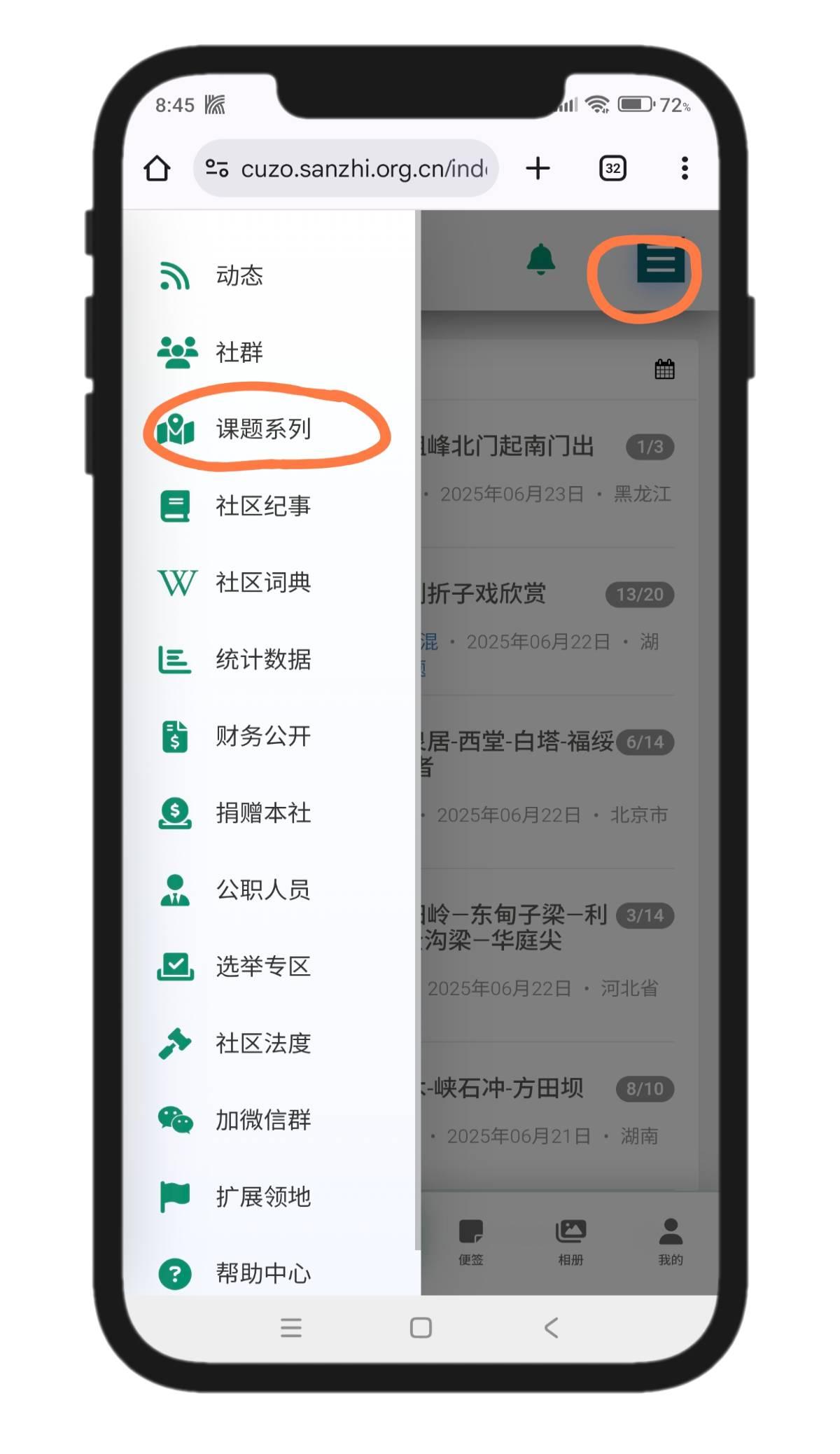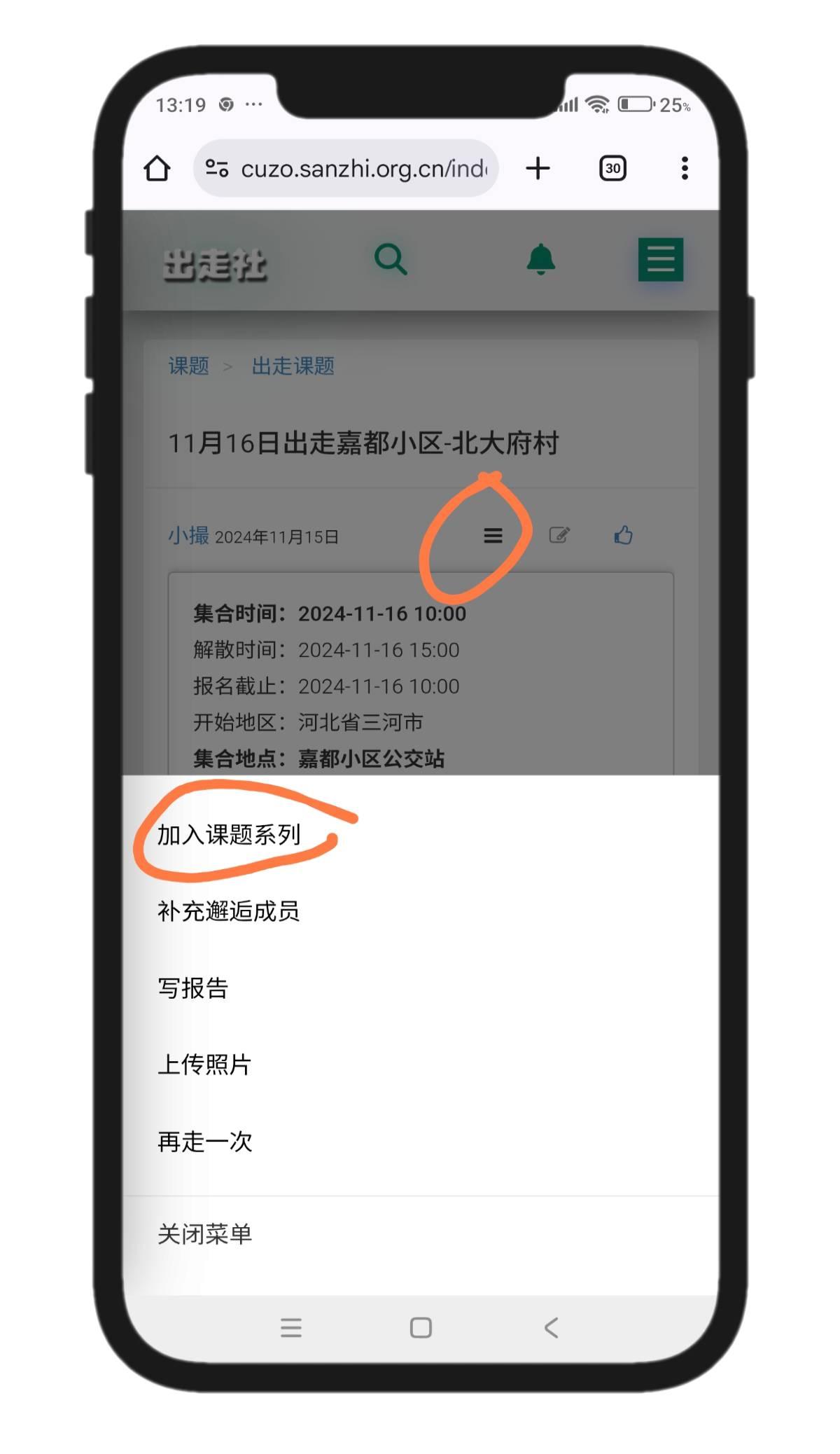 点击标题右下小抽屉图标,呼出操作菜单,点击“加入课题系列“,进入选择系列的页面,点击标题,完成操作。