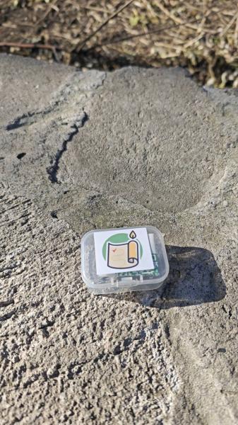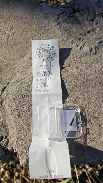 沿着防火道走了一会儿,看到一座亭子,叫朱德亭。社友“大磨盘”藏的宝就在亭子西北角附近路基砌石的缝隙里,我一眼就看见了,他在趣找小程序提供的描述非常准确,真是友好的宝主。按照他的提示,我用一根树枝把宝盒取出来,打开,在纸条上留言,扫码,再放回,行云流水一气呵成。