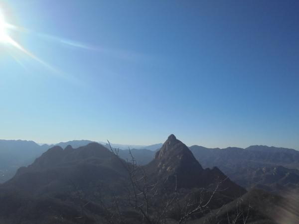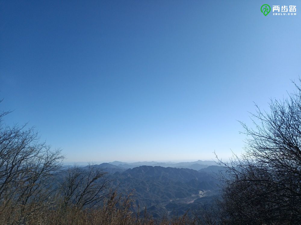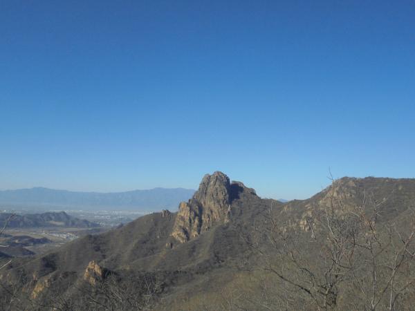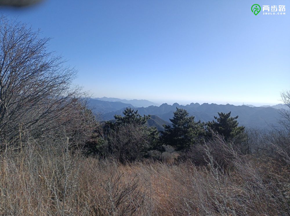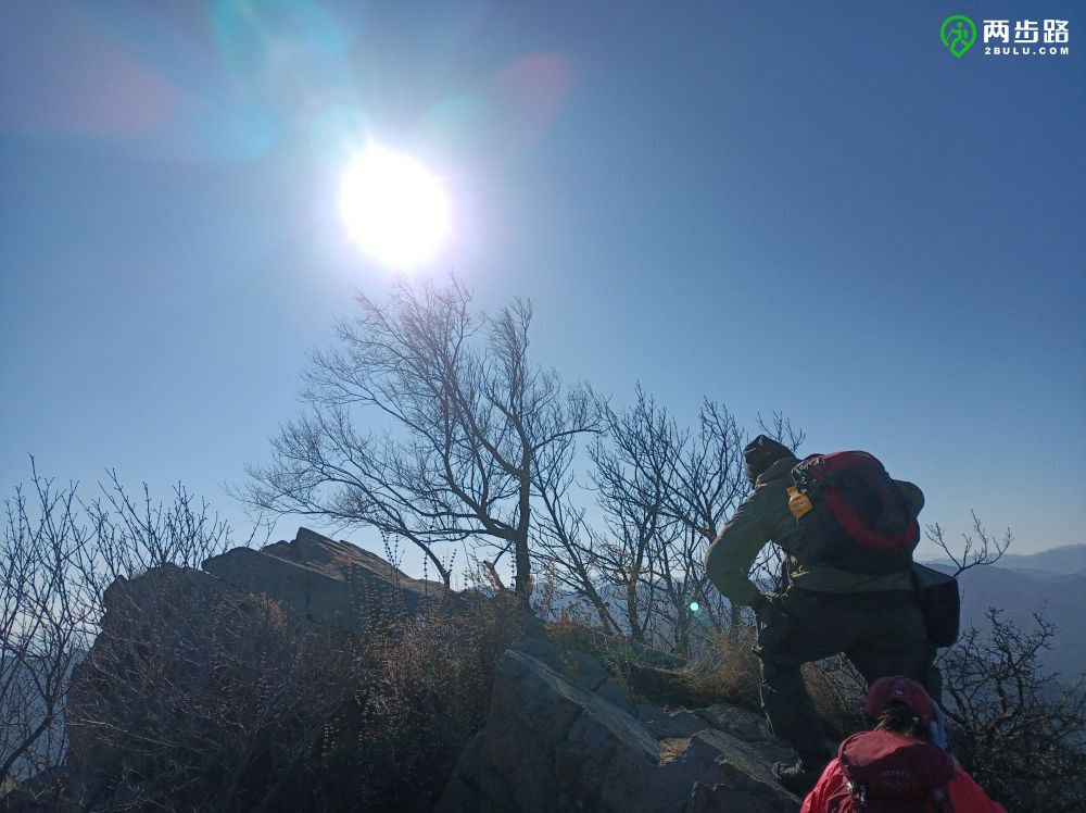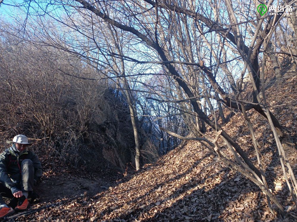 燕羽山-蚂蚁山B一段路,在七年前属于冷门线路,并无可圈可点之处,但得益于燕羽山之火爆,此段路途作为燕羽山环穿路线的一部分,已被北京诸路野外势力共同开发为一成熟小路,宽阔好走,路标密集,即使今日冰风似剑,一路上也常可遇到山友同甘共苦。此一段路上,唯二的难点,在于燕羽山以南一段陡降,以及临近蚂蚁山B一处断崖处:前者坡度甚陡、碎石甚多,伴有一定小崖,有一定暴露感,走友需降低重心小心缓行,雨、雪天气慎走;后者则可以从山脊北侧走成熟小路绕行通过,当然,如果对自身攀爬能力足够有自信,也可以选择从断崖处徒手攀下。至于首尾两个难点之间,则多以平缓舒适的山脊路为主,爬升、下降均不太明显,局部植被较为稀疏,风力迅猛、视野开阔,可一手格挡寒风,一手遥指暖阳。