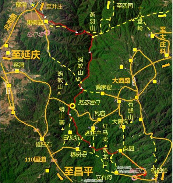因此行涉及区域在明代属“陵寝重地,祖山严禁,风气关乎国运兴衰”,“修筑墙墩,不便宜作”,明内边长城在石佛寺与龙泉峪之间中断,“不修边墙者九十里”。不过,砖石大墙的空虚,并不意味着永宁城以南直至十三陵之间没有任何长城遗迹,事实上,若不考虑北齐长城,仅就明代而言,此段军都山脉中,从外及内,防御系统仍可数出四道。第一道为嘉靖二十二年(1543)始建、嘉靖三十五年(1556)扩建的宣府镇南山路边垣,绵延于延怀盆地南缘、军都山脉北麓,此行起点的柳沟城为南山路沿线主要城堡,嘉靖四十五年(1566)设参将驻劄,万历年间又得增修,为南山路路城。第二道为东红山支墙向东南分出,经果树园隘口墙、荒坡梁、什锦口布设防线,墙体不连续,大段利用军都山主脉之山体设防,以毛石干砌隘口墙、墩台、堡砦为主,其建设年代与隶属关系尚有一定争议,可能是南山路边垣的一部分,也有可能是嘉靖三十七年(1558)兵部尚书杨愽上书请修、后续嘉靖直到隆庆年间建设的“南山大墙”。第三道为明十三陵外侧六口(德胜口、燕子口、碓石口、贤庄口、灰岭口、老君堂口),在嘉靖年间因险制塞,修建有小段隘口墙并少量墩台驻防,兼为长城防御体系与陵寝防御体系的一部分,此行涉及的碓石口,即在嘉靖十五年建(1536),今立石沟、边墙子、锥石口等地均有碓石口下垣墙遗存。第四道为明十三陵内侧四口(西山口、榨子口、中山口、东山口),嘉靖三十年(1551)前仅西山口有墙垣,后续经嘉靖、隆庆、万历年间的陆续扩建,至天启三年(1623),据大学士孙承宗建议,方高筑陵墙,将内四口完全连通,而清代入关迤至现代,为道路及水库建设考虑,四内口陵墙被陆续拆除,仅有卧虎山、龙山、汗包山山体上尚有部分墙体残存。