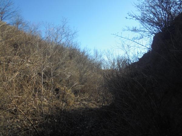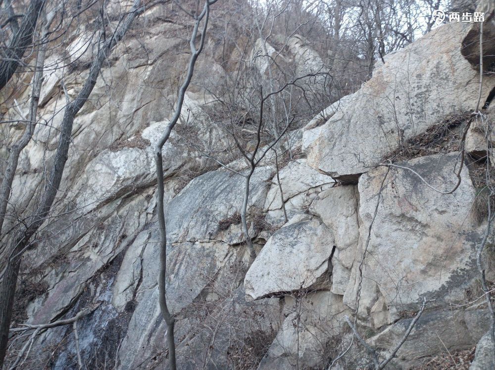 下午15:07,经历近两个小时的搏斗,一通生切,走友终于探通此行第二段路况较差段落,狼狈抵达西庄户南垭口处,垭口处有明显铲削痕迹,证明这里在过去应是西庄户与立石沟之间的翻山村道经行之处,不过今日登顶红马梁的主要目标尚未完成,走友在此不得不再此放弃村道的诱惑,选择走巡线小道向东继续向红马梁主峰移动。值得一提的是,垭口东南侧,一行人在此发现一废弃的人为开凿洞穴,不知有何用意,有可能是过去的矿洞所在。