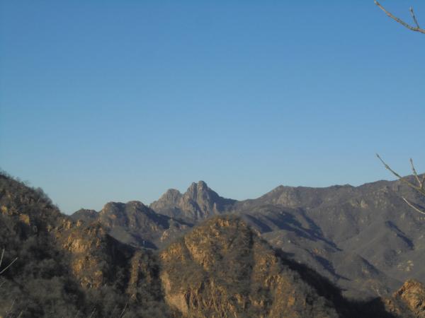 2.西峰实测海拔约904米,高于上石峪北梁、蟒山,可知以上两峰均在与西峰高度平齐的地平线下,现需证明,东Ⅰ峰与东Ⅱ峰在此照片中均在与西峰高度平齐的地平线下。