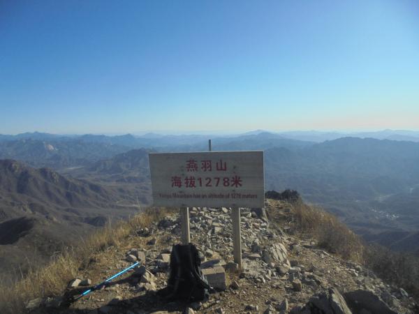 肚子不舒服,顺道照顾后面队友,行进速度较平常略慢,10:43,时隔七年、第二次登上海拔1278.3米的燕羽山主峰,这里除了三角点水泥定位墩以外,又多了一块果树园登山步道配套建设的木标志牌,用中英双语标注“燕羽山 海拔1278米”字样。燕羽山为侏罗系髫髻山组安山岩形成的岩石山峰,为南北双峰结构,因双峰自山脚仰望形如燕子的尾羽而得名,此山得以成为延庆一大名山,除略高的海拔、优越的地理位置与较宽松的管理环境以外,即多要拜其在温润中略带放纵、在柔和中略显锐利的山型所赐,一山若自妫川盆地中仰望,挺拔匀称有如火山渣锥,而若切身涉足其间,又可在坦途上下见有巨石峥嵘、巉岩兀出,可谓恰到好处。燕羽山顶地势陡峭、山石裸露、植被稀疏,视野极其开阔,北瞻可睹海坨艨艟巨舰遨游天海,南瞰可知军都苍莽群山烟云几重。