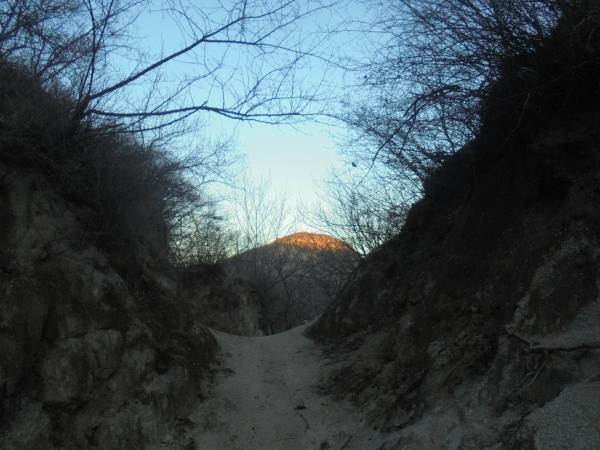 打卡红马梁后,夕阳西下,天色渐暗,白昼已所剩不多,为尽量快速下山,本人在此择一小沟无路下切抄近路,效果尚可,沟内有废弃堰田遗迹,灌木不密,仅临近主沟处有一小断崖需走友自行寻觅突破口。与谷底小路并和后,左转向东下山,途中一处6-7米高的水断崖是唯一难点,此行有攀爬经验丰富的强lv直接攀下,但从东北侧的小路及陡沟下行应为更稳妥选择。通过此水断崖,后续至西梨园废村的大片梯田处,接上成熟小路,继续出山即无危险。这里如果时间富裕,也可以继续向南爬陡坡去往双龙山方向,冬季日光短暂,今日至此已临近日落,为安全考虑,还是在此择备用路线借梨园村的大路出山。