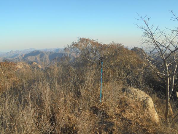 15:47,在另一废弃矿洞之上经过最终的爬升,三人终于全网首登红马梁,实测海拔约904米,山顶没有任何标记,植被稀疏,视野开阔。红马梁记录于《北京市昌平县地名志(1997年版)》(下称“《地名志》”)中(在地名志中标注海拔872米),因花岗岩含铁呈红色,且山势形似奔马状而得名。除实测海拔约904米的西峰以外,其东南侧另有两座山峰,从山下目测与西峰海拔相当接近,但从西峰山顶实拍的照片证据来看(其证明过程可见附录一),已可确凿证明西峰即为红马梁一山之主峰所在。当然,因904米的海拔与《地名志》中872米的海拔并不吻合,类似蚂蚁山状况,也可能出现实际的红马梁位置并非主峰位置这一情况,若需确切理清其中关系,或许仍需借助当地知识考察、求证。