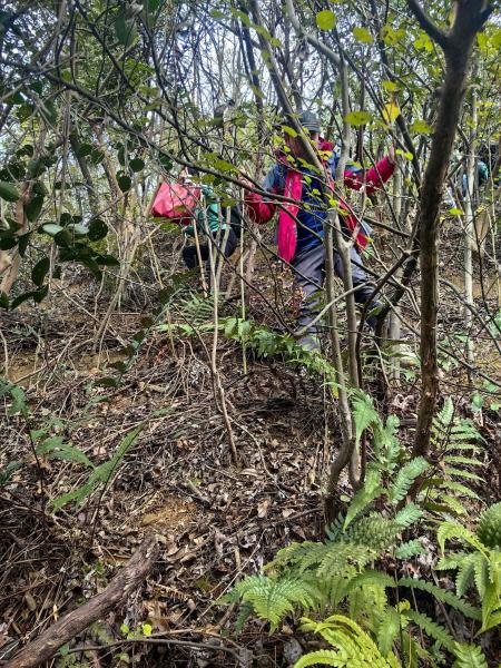 这是一条十字路口,向南的小路已被年初的冰灾破坏,向西可以看到山头上新挖的防火道,那里应该可以很方面地下山,为了增加课题的趣味性,我选择向东上山,然后在一条山梁上直接擂下山。