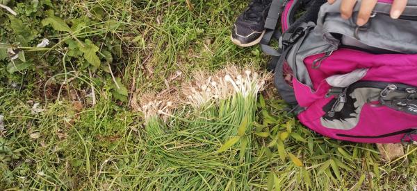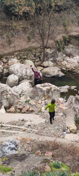 五人快步往金阳。幽静蜿蜒山谷,重走一次,也有不同的惊喜。路边胡葱非常多,特殊的会吸引人前进,挖半个小时,心满意足再走。遇到小路,上去看看,下去走走,不一会就下到山底,有人喊我们,烤火喝茶聊天,一坐又是二十五分钟,村民热情,我们神侃拍照。