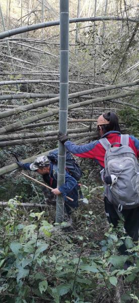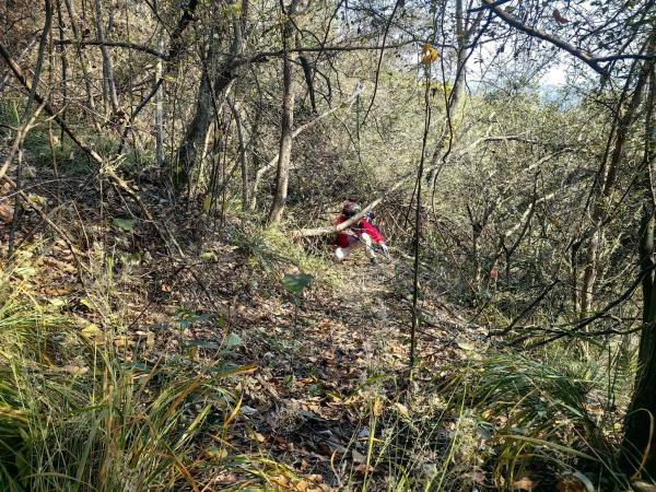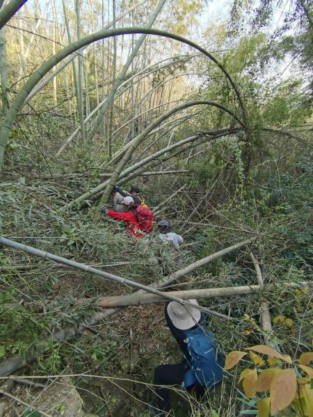 离开它之后,我们向南探路下山,在一个十字路口,我们挑了一条看上去好走的线路,向东南方向直接擂下山,结果这个方向在接近山下的地方,倒下的竹子让我们吃足了苦头。