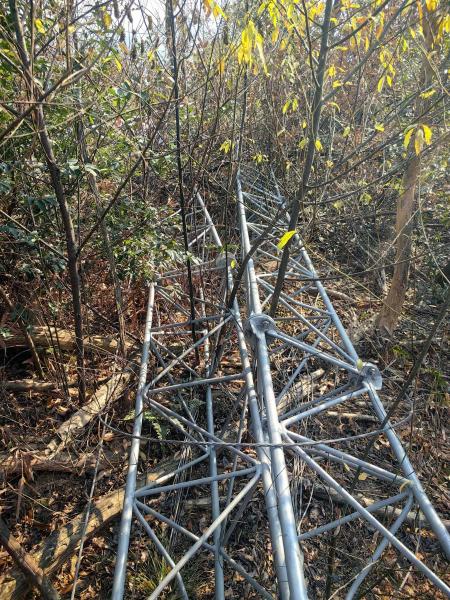 这个铁架子向南边倒下,断成了几段,也不是呈直线地倒在山上。