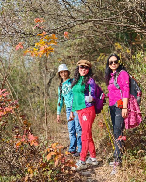 Sunny开车,窑岭到昭山脚下约四十多分钟。沿着绿道步行到观音寺 ,10点一刻与大家汇合。美丽的姑娘们在泡咖啡,吃水果,沐浴阳光下有说有笑。