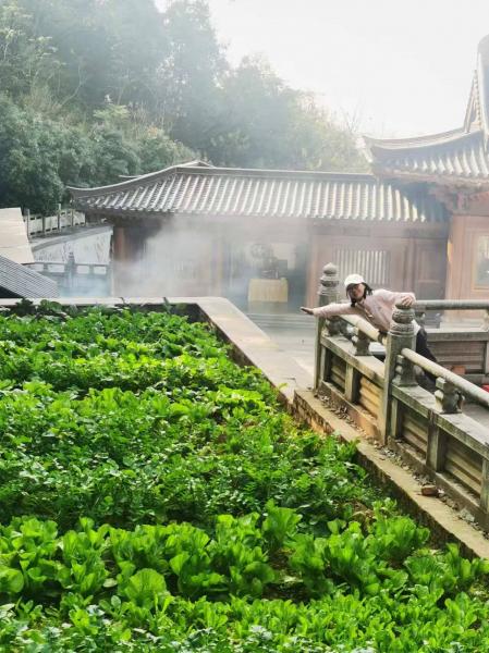 左边是餐厅,斋饭先扫码预订;左下边是菜园,香火熏旺;右边是大雄宝殿,右最下边是卫生间;中间往下左边有昭山古井,湘江轮渡码头。草坪上大伙晒太阳,商贩卖着烤红薯玉米豆腐脑等。
