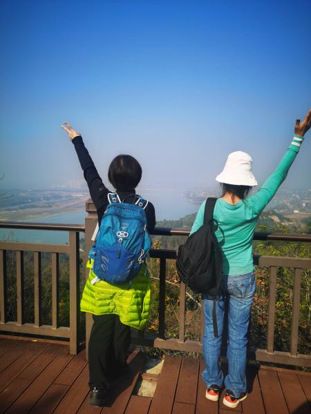 先登笔架峰,出观音寺北门往左,沿大道向上,三岔路口右边上坡就到,观景平台,红日升起一定壮观。西北边望去,湘江若隐若现,兴马洲似大船在水中,北边最远处高楼,估计是暮云街道莲华村一片。看东边,在探寻来时路,芙蓉大道向南也有向东的时候,阳光在前在左变换,一切都在变化中。