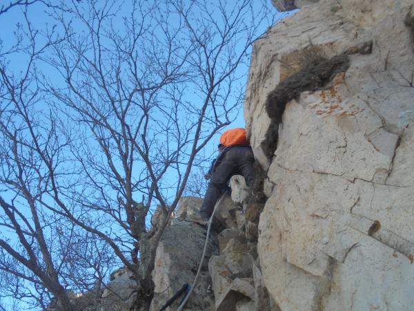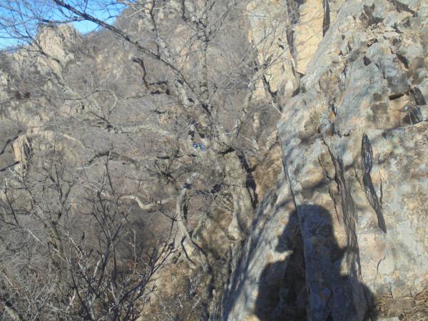 登顶抓角山,在山顶略作赏景、拍照、嘚瑟,随后准备向北继续行进去往金华山方向。抓角山北坡,山石峭立,巉岩兀出,其中的断崖5,高差大、暴露感强,为抓角山北坡唯一难点、也是本次活动中的最大难点所在,此行走友意外在此发现一根绳索坚固可靠,可保护行者安全通过,在此本人向好心助人的走友前辈深表感谢!