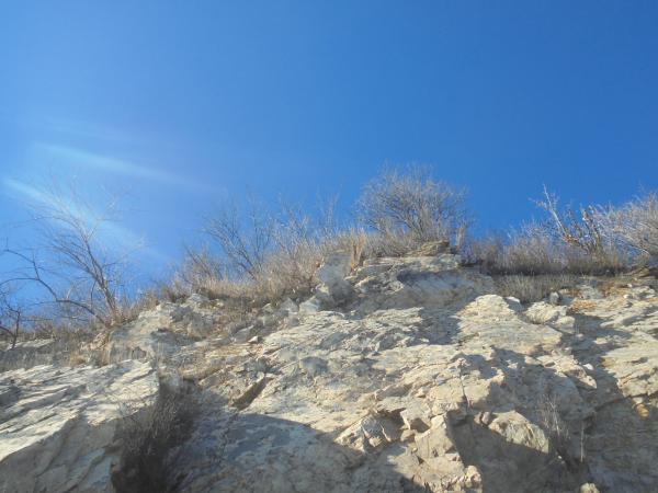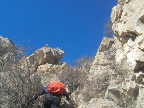 水峪沟垭口与抓角山主峰之间,上下有层层崖壁相隔,参考轨迹走法较为复杂,走友需结合轨迹与现场实景仔细选择前进方向。自水峪沟垭口向西沿主山脊行进,遇断崖3绝难攀爬,起初向右探路未果,转而向左沿崖间栈台横切,不远遇一突破口,可借此登至上层。随后右转向北作陡升,遇山脊断崖再回折向左,攀爬难度较为简单的小断崖4,即可来到抓角山所在脊线,自此复左转向西,在岩石山脊上稍作攀爬,即可顺利登至抓角山主峰以上。