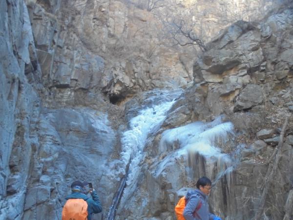 言归正传,借南湖村向西进山,至水泥路折转处,走友可有左转向西南上山、直行走沟进山两种选择,前者似乎路况较好,但为了那隐藏的惊喜,在此走友还是选择后者,直行走沟进山。踏行小段冰溪后,一白色精灵赫然飞挂于黑色崖壁以上,此即为南湖大冰瀑之所在,该冰瀑高度10米左右,玉液琼浆凝为殿宇,芙蓉泣露冻结半空,其南侧另有南湖山谷度假村营造的人工冰瀑,衬托于天成玉体,则显得东施效颦而已。