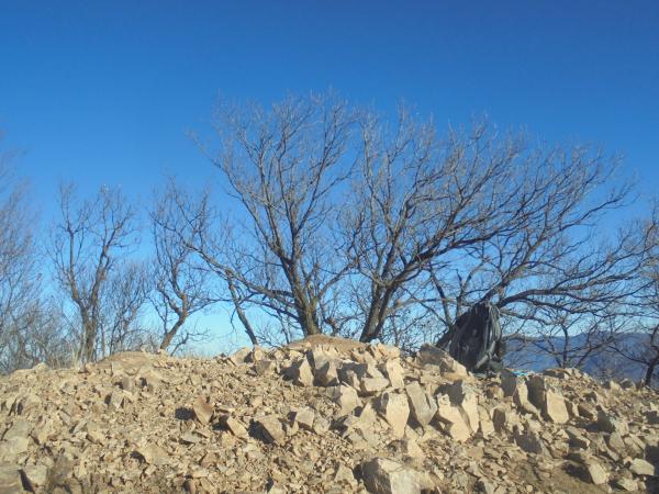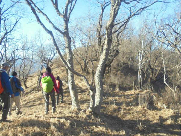 坐在金华山顶的蚂蚁窝上,稍稍补充能量后,集合7人继续向蔡树庵方向赶路,自山顶至其西北侧垭口,起初下降一段,有两个左转点位相当不明显,很容易错过,建议走友在本段路上加强参考轨迹的核对,以防一直沿山脊走岔太多。两个关键点位以后,小路路况转好,平缓宽阔,走起来很是舒服,或为曾经的越岭村道遗迹所在。横切至金华山西北垭口,此处为金华山一带又一相当重要的四岔结点,东南侧小路上金华山,东北侧小路下沟去往乱佛寺、柏林城,北侧走山脊可一直钻林子爬崖通往断口岭一带,此行则选择在此左转向西南,准备沿支脊前往蔡树庵长城方向。