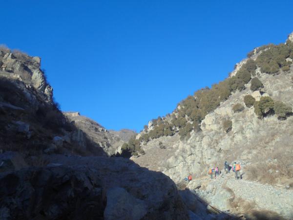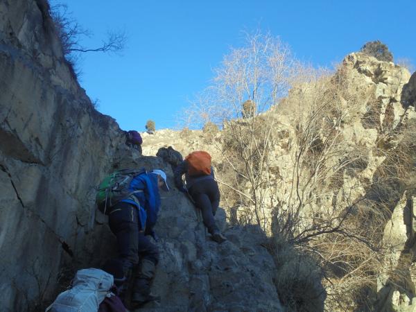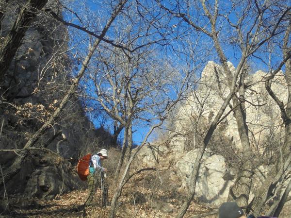 市内交通—金安桥停车点(7:28)—南湖村停车点(9:06)—水泥村道—南湖山谷上山口(直行)—南湖大冰瀑(9:13)(左绕)—小断崖1(攀上)—流水山谷—小冰瀑(右绕上山)—冰瀑西三岔1(右转)—冰瀑西三岔2(直行走北支)—陡升—小山脊三岔(右转)(10:08)—小断崖2(攀上,这里从右侧切过更好)—岩石山脊—水峪沟垭口(直行)—断崖3(左侧横切)—狭窄栈台—突破口—陡升—小断崖4(攀上)—岩石山脊—抓角山(1454米)(水泥墩、腐朽松木)(11:14)—断崖5(攀下,有绳索保护)—抓角山北三岔(左转)—电线杆垭口(直行)(12:08)—断崖6(右侧横切)—落叶坡1陡升—断崖6北垭口—草坡1陡升—断崖山脊(左侧切过)—草坡2陡升—信号加强铁塔(13:35)—金华山B(1712米)(右侧切过)—金华山垭口(直行)—断崖7(右绕)—落叶坡2陡升—金华山A(约1735米)(14:11)—金华山东北山脊(左转下山)—金华山北垭口(左转)(14:45)—毛石干砌墙体—岩石山峰(右绕)—汤家庄断裂带(岩性转变为花岗岩)—蔡树庵长城东三岔(直行下山)(16:26)—山脊三岔(走右侧山脊)—砂石坡陡降—长城洞西上下山口—水泥村道【—蔡树庵村—长城洞—蔡树庵村口停车点(17:17-约19:00)】—中关村西停车点(约21:30)—市内交通难度:大(强度一般+路况差+少部分攀爬路段+较多落叶、砂石易打滑路段)要求走友:具备丰富的探路经验、强大的路感、较强的体能素质、较强的时间控制能力、一定的攀爬能力、较强的心理素质,新、弱、恐勿走,雨雪天气慎走行程轨迹见六只脚#8564391