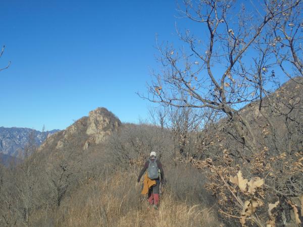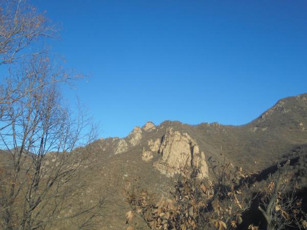 金华山僻处险远,除少数越岭古道途经隘口以外,并非明长城体系中的防御重点,石长城循山脊绵延一段距离后,即消失在了草木与山石之间,此后直至蔡树庵04号马面西北侧墙体断点,明长城即完全采取以山险代城墙策略,在两处重要隘口之间以山作城,而未筑有城墙、敌台防御。走友自山脊墙体断点向西行进,不远前方出现两座岩石山峰,垭口一侧隐现的石蹬状岩石极具迷惑性,容易误导走友在无意中涉入险境,实际上两座山峰均不必攀爬,而是从垭口向右横切即可。两座岩石山峰西侧垭口,为紫荆关断裂带一分支断裂——汤家庄断裂经行之处,越过断裂后,由百花山-镇厂火山盆地进入大河南岩体,岩性由侏罗系髫髻山组安山岩转变为白垩系花岗岩,另外,循汤家庄断裂走向向北北东方向远望,可见断裂东侧因岩层错动抬升形成的一系列岩石山峰,由此可见金华山-抓角山同处于西侧汤家庄断裂、东侧紫荆关断裂两条断裂的上升盘,在地质学上属于典型的断块山地。