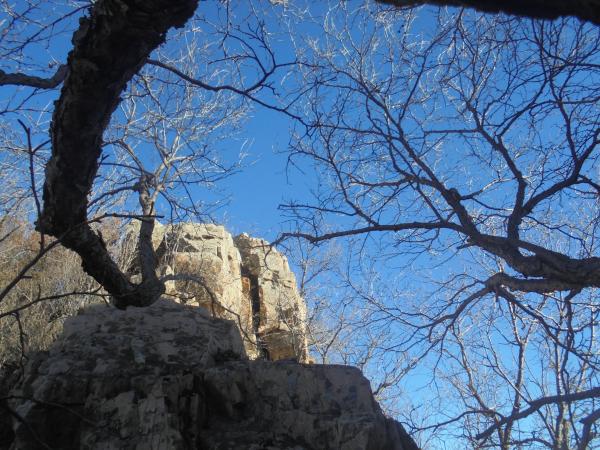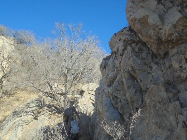 此行走友选择走北支路线爬升,经历谷底一段缓升、小山脊一段陡升后,约10:20升爬至抓角山东侧主山脊,这里本人选择右转向西走主山脊,攀爬小断崖2、登岩石山峰,事后复习,观察路网细节,注意到这里其实不必走山脊爬崖,从北侧的树林里横切过去是会更优选择,当然,小断崖2攀爬难度不大,如果走友沿山脊行进,则在辗转与远眺中,也将自得一番乐趣。