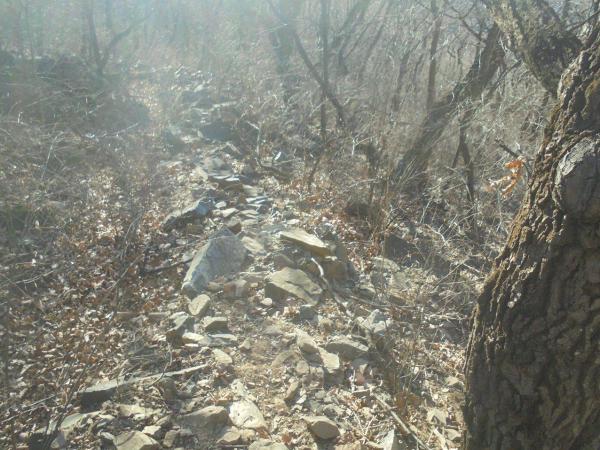 自垭口左转,未及数步,落叶丛中出现一低矮墙体,沿山坡敷设,起初以为是堰田的干砌石墙,沿墙体行进不远,石墙逐渐横切来到支脊的山脊线上,此时方才恍然大悟,意识到这应是明长城的组成部分。本段墙体向西南延续数百米之多,在“中国长城遗产网”中未有收录,均为毛石干砌石墙,未见墩台,形制与昌、蓟二镇中嘉靖年间所建墙体相似,或为马水口路大龙门下嘉靖年间所建六口之一,建设年代应较隆庆-万历年间所建蔡树庵“雕花长城”主体更早,而与北侧断口岭一带发现的毛石干砌隘口墙更为接近。