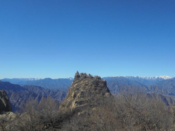 抓角山位于南湖村西、水峪沟西北、蔡树庵东南,海拔1454米,由晚侏罗世髫髻山组安山岩组成,山顶双峰结构形似发髻,故名抓角山。抓角山顶有水泥墩(曾经疑似立有木制三/四脚架觇标)作为标记,四周岩崖环绕,视野极其开阔,向西远眺,天外可见小五台山青峰雪域,向东俯视,人间可见拒马河川烟尘弥漫。除此行登顶的抓角山主峰以外,其南侧隔深壑另有一次峰,目测四周绝壁环绕,登顶难度较主峰明显更高。