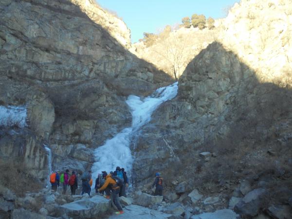 震慑于神域,一行人在此合影留念,旋即准备自大冰瀑南侧小道攀升绕行至其上方,途中走友需攀爬小断崖1,难度简单,暴露感略强。大冰瀑上方陡沟中仍有活水尚未封冻,溪流跌落处另暗藏有一小冰瀑,走友稍作观赏后,自其右侧再手脚并用略作攀爬,即可来到陡沟上方较平缓段落中,与方才自西南侧上来的常规上山路线汇合,一同沿宽阔沟谷爬升去往抓角山一带。
