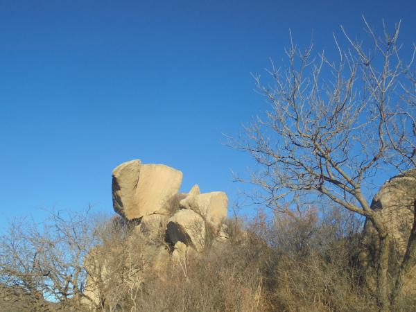 越过汤家庄断裂后,进入花岗岩地貌区,花岗岩虽为一孕景潜力巨大的岩石种类,但这里的大河南岩体因处于汤家庄断裂下降盘,与两侧河谷之间的相对高差较小,花岗岩地貌仅在紫石口沟深度下切的大龙门口一带发育较为成熟,称“龙门天关”,而在蔡树庵一带的山岭以上,则仅因球状风化作用形成部分圆润巨石,而笋峰、光坡、岩壁则几乎无处寻觅。走友穿行其间,仅少部分圆润巨石堆叠之处需要从旁边小心绕过,大部路段则普遍较为平缓,难度不大。其间部分地带视野较为开阔,东侧足以回望金华巨峰高巍天顶,西侧则可见蔡树庵诸烽台渺然于五台雪峰之下。