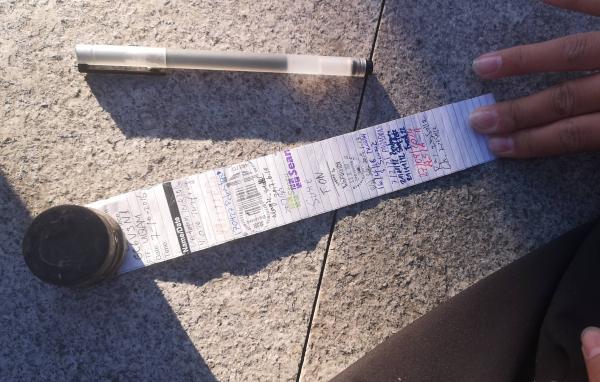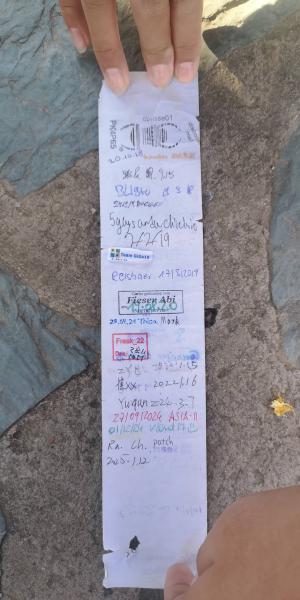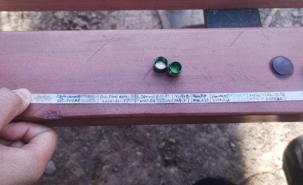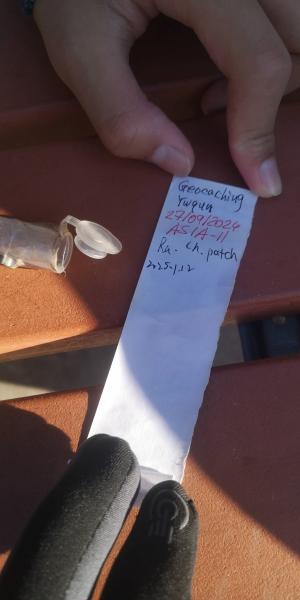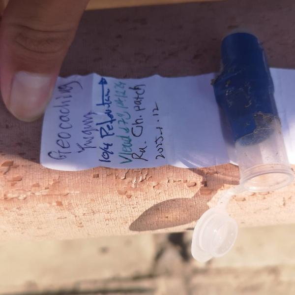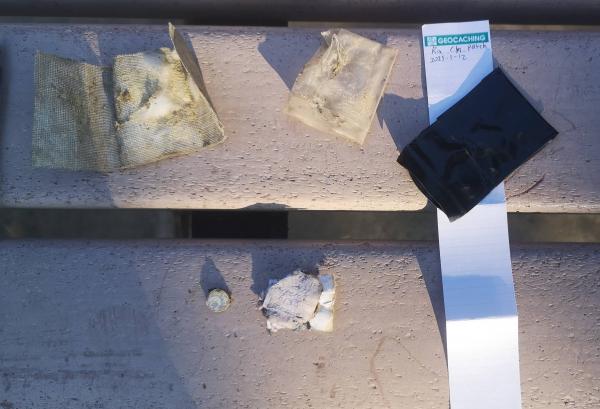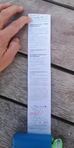 看每个宝的签名,最早的是2016年2月,差不多十年前,正反面都快签满了。有一个已经残破不堪,我们在原处换了一个。最精巧的一个只有小指盖大小,绿色小瓶,自带磁铁,放在长椅下和椅子腿一样颜色,看不出是外来物。这么巧妙精致的物件,我们猜测也许是Geocaching自己出品。