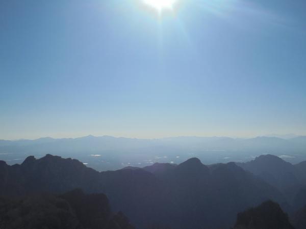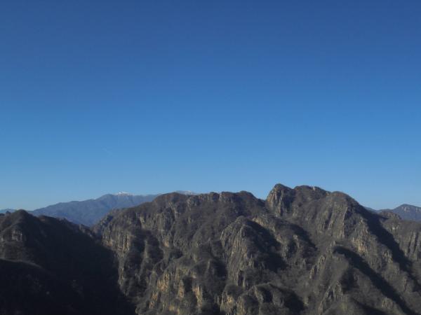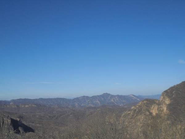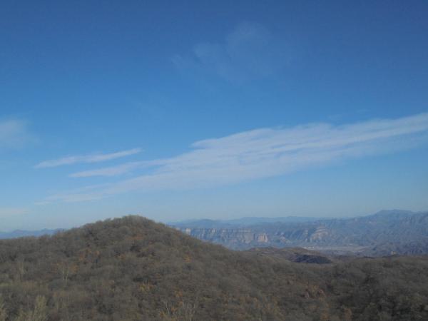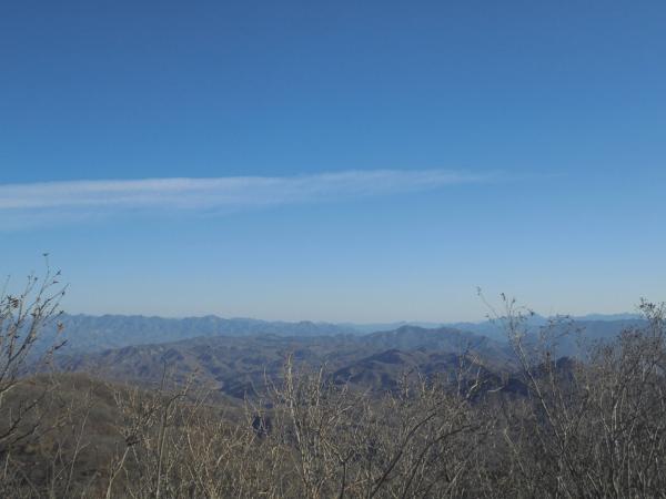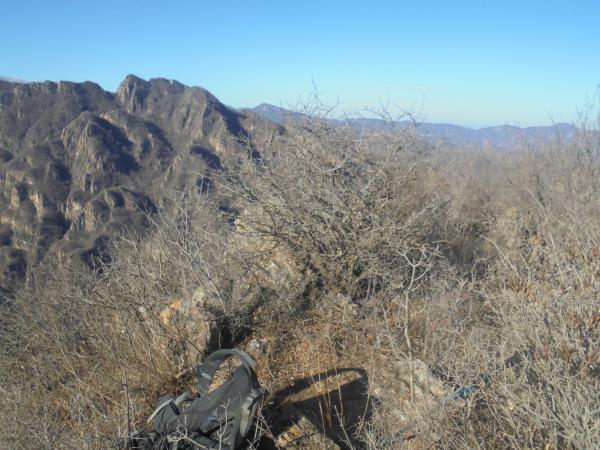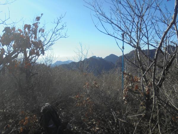 6.10:55,登顶小麻山,该山位于太安山西北、家渠西南、大麻山东南,海拔约1339米,山顶没有任何标记,植被略密,山石上方西侧、南侧视野开阔,仰望可见海坨戴雪高踞九天上下,俯瞰足有隆永营堡渺茫于烟霭内外。蛇、181在峰顶稍作观景、休息,与出现意外状况的低调汇合,三人一同午餐后,于11:25左右再度出发,继续向不远处的大麻山移动。
