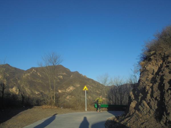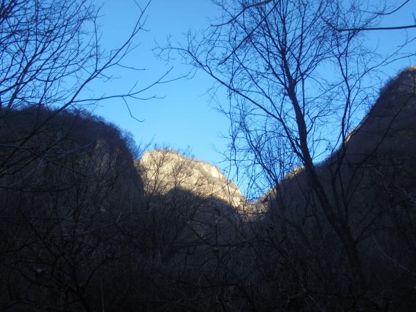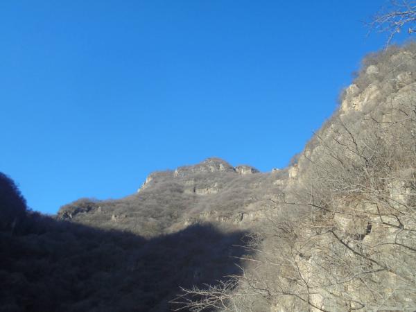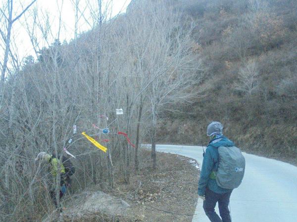 15:10,走友抵达月亮湾岔口,在此结束踏冰,准备经成熟路线翻山至黄柏寺下山。此段路线在一南北向张裂隙的基础上开辟而成,经过官帽山与南崖之间的延庆北山山脊最低点,顺直好走,难度不大,纸面上的200米爬升、2公里路程,在一路闲侃中,人间之气息便已浓郁。