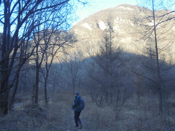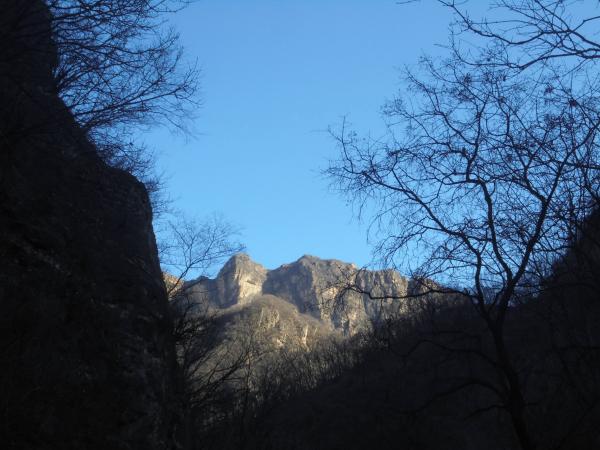 在撂荒田地前方左转,沿野猪窝东沟下行去往东直河、龙庆峡一带,此后约3.8公里路,走友从众神的脑瓜顶来到众神的脚趾缝,虽与苍穹与飞鹰渐行渐远,但那冬日倾斜的光照,打在深渊与层巅之间,创造出极致的二分世界,沟谷深处的行人,穿梭于光影,时而温暖,时而仰望,震慑、驻足、惊叹、追寻,仅是在转瞬之间。而在路况方面,野猪窝东沟路线则可分为上下两段,上段路线为沟谷两侧的成熟小路,走起来很是舒适,可谓龙庆峡断块山地中不可多得的景观大道,而下段路线虽旧时开辟有简易机耕路,但在历年山洪中已基本被冲毁,如今走友沿流石滩蹦跳而行,膝盖、脚踝需要注意扭伤风险。