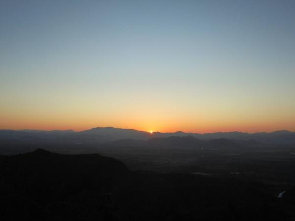 接上成熟小路后,左转沿云瀑沟西侧山脊向北上山,该段小路目前已被云瀑沟景区初步开发,虽未铺设石阶蹬道,但在断崖处已设有简易铁梯供行人攀越,且部分位点有崭新的导览地图指路。从导览图中,可知云瀑沟西脊上有“二土埃”、“头土埃”等地名,或为当地村民对土城子组砂砾岩风化形成的紫红色砂土的独特称谓。走友在拂晓晨风中快速行进,至7:39,日出南山,火光迸裂,短暂的金色世界以后,再度睁开双眼,群山上下,已是一片青蓝。