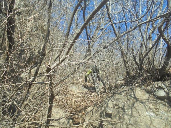 4.经右沟艰难陡升,至海拔约1064米处遭遇断崖1,自左侧绕过后,发现一模糊兽道上山,查看循迹软件,发现已与原计划向西北横切返回大雅新风所走沟谷的手绘参考轨迹渐行渐远,由此也便将计就计,转而循小麻山东南侧山脊探路上山,模糊路径断续隐约,灌木不甚茂密,无需攀爬断崖。海拔约1164米处的一处裂缝为本路段唯一难点,坡度甚陡,落叶很滑,脚下难以借力,走友借助两侧树杈生拉硬拽上去,很费臂力。