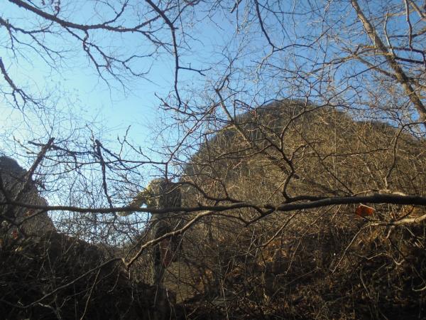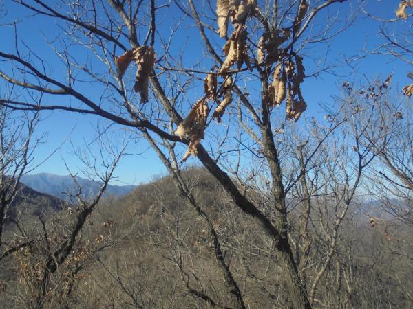 8.自大小麻山垭口向北沿山脊大方向寻灌木稀疏处爬升,与白塔村借大麻山东北侧沟谷上来的路线汇合后,再左转向西沿模糊路迹行走不远,即可见大麻山主峰隐现于枝桠之间。跌宕过一小垭口,临近大麻山处的一小段陡升为一难点,落叶较滑,间或少量简单攀爬段落,需走友手脚并用。
