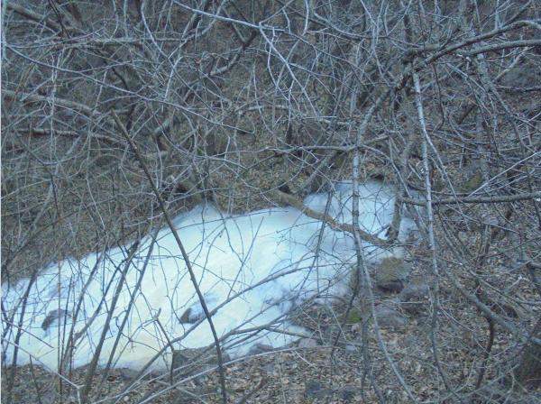 在横切小路上大肆享受,接上白草洼去往后城的翻山水泥公路,沿水泥路行进小段后,再向右抄近道走小路稍作爬升,8:42,抵达太安山垭口,两侧有小段毛石干砌隘口墙遗迹,据延庆越野跑爱好者兼民间学者侯志刚先生考证,此处系明代所设苗乡岭西顶口,城防设施应为明永乐十五年(1417)修建,连通其西侧的龙庆峡、海坨山诸山险、屏障,以及东侧迤至辽坡、佛爷顶一带诸隘口、墩台,一同组成了明代早期隆庆、永宁与朵颜三卫之间的重要防线。太安山垭口同为一穿越节点,西侧有路去往洋人洞,而此行走友则选择翻越垭口经水泥公路行进小段后,再左转陡降去往东直河乃至大小麻山一带地区,下降途中,见路旁有冰泉冷涩,为东直河源头之一。