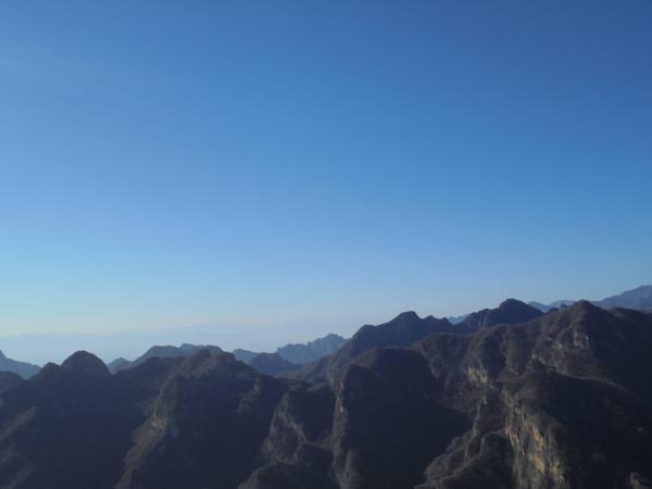 8.沿山脊下降至大麻山西北垭口,这里向东北走沟似有路可下山至白塔村,此行走友继续沿山脊行进,面对岩崖阻挡本疑无路,在低调大神的超强路感加持之下,却是探出一崖间密径,三步两步蹿上,身登万丈绝壁,手摘九重星辰。