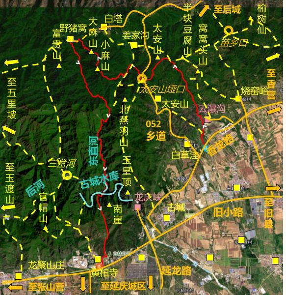 市内交通—清河站(5:59)—D6701次(21元)—延庆站(6:28)—打车(45元/3人)—白草洼东路口(6:55)—机耕路—树枝路障(左侧绕过)—碎石沟—玉米田(尽头下沟右转)—模糊小路—无路上切(多酸枣、碎石)—云瀑沟西脊【(接上成熟路、左转)—简易铁梯—二土埃(看日出)—头土埃—云瀑沟太安山三岔(直行)(7:58)】—云瀑沟垭口(直行)—太安山东垭口(左侧横切)—松林小路—水泥路太安山岔口(右转)—水泥公路—抄近道小路—太安山垭口(右转)(8:42)—水泥公路—太安山东直河岔口(左转)—冰泉—东直河沟脑四岔(左转)—东直河—东直河小麻山岔口(右转)(9:04)—小麻山东沟—(左转避崖)—隐约盘道痕迹—小垭口(翻越后右侧横切)—模糊小路—陡沟三岔(走右沟)—陡升—断崖1(左绕)—小麻山东南脊【—裂缝(陡升)—】—废弃梯田—小麻山(约1339米)(午餐)(10:55-11:25)—大小麻山垭口(直行)—大麻山东三岔(左转)—(无路陡升)—大麻山(1383米)(12:06)—大麻山西北脊【—狭窄山脊—小断崖2(攀下)—大麻山西北垭口(直行走山脊)—崖间密径—崖顶高地(右转)—倒塌界桩—白塔野猪窝垭口(左转)(12:52)】—机耕路(部分可走小路抄近道)—野猪窝东沟岔口(左转)(14:04)—野猪窝东沟【—清晰小路—沟底流石滩—】东直河野猪窝岔口(右转)—东直河(大段流石滩,小段沟边小路)【—石塘—北库尾(14:44)】—古城水库踏冰【—游船堆—东直河口(右转)—月亮湾—月亮湾岔口(左转)(15:10)】—小段登山步道—黄柏寺垭口—仿古城墙—机耕路—防火岗亭—黄柏寺村(水泥村路)—(右转)—旧小路—黄柏寺公交车站(16:19-16:32)—Y43路(1元)—延庆东关(17:03)—919路区间(6元)—沙河(18:44)—市内交通