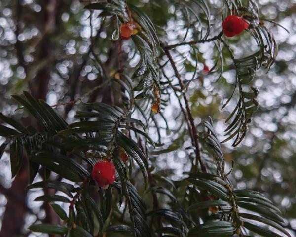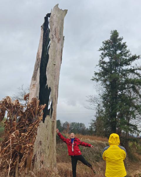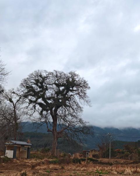 3号清晨6:30,天开始蒙蒙亮,远山云雾弥漫。大家决定停车好好一观乡间晨景。拐进路旁沙田镇东风村委会,有一早起忙碌的妇女。社牛武哥当仁不让开始外交。我们转悠一圈,发现院门前的红豆杉上,雨雾中红豆晶莹欲滴,貌似一两只小松鼠在树枝间蹿上跳下。屏息凝神,举着手机追逐小松鼠的踪迹。原来是一群花栗鼠。小家伙们沿着楼板在门口两棵红豆杉间飞窜,两只爪子捧着红豆美滋滋地进餐……清冷的晨光,灵动明亮起来。
