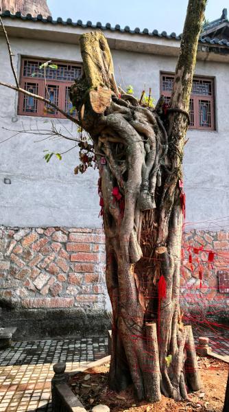 4号早上8点多,我们从小路进入丹霞山,乔木高耸,树林阴翳,很有热带雨林的感觉。无意间发现一棵小树上长着数片大小不一的木耳,摸着厚实柔软,煞为可爱。在武哥的惊呼声中,我忍不住全部撸了下来,珍宝般藏在了口袋里——孰料第二日便捂成了干巴巴黑乎乎的模样,此为后话。翻入景区后,一路依旧无人。在爱情谷、卧龙冈、翔龙湖路口见到路牌,才明晰了方向。卧龙冈有群白衣女子在练功,我们右转往翔龙湖方向。路上游客逐渐多起来。我们大概途经了阴元石——只是流苏和我全然不知,然后攀长老峰,从别院禅寺一侧下山。禅寺后有一棵很奇特的树,粗壮的树干,数处被锯断,直冲天穹的是一枝罗汉松,旁逸斜出的是一枝榕树。路牌的介绍此即绞杀树——若非人为干预,罗汉松许是连这一小枝都保不住了!